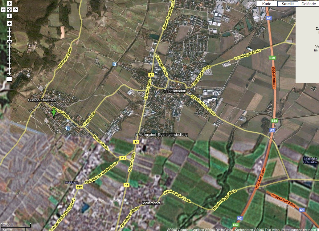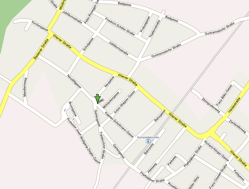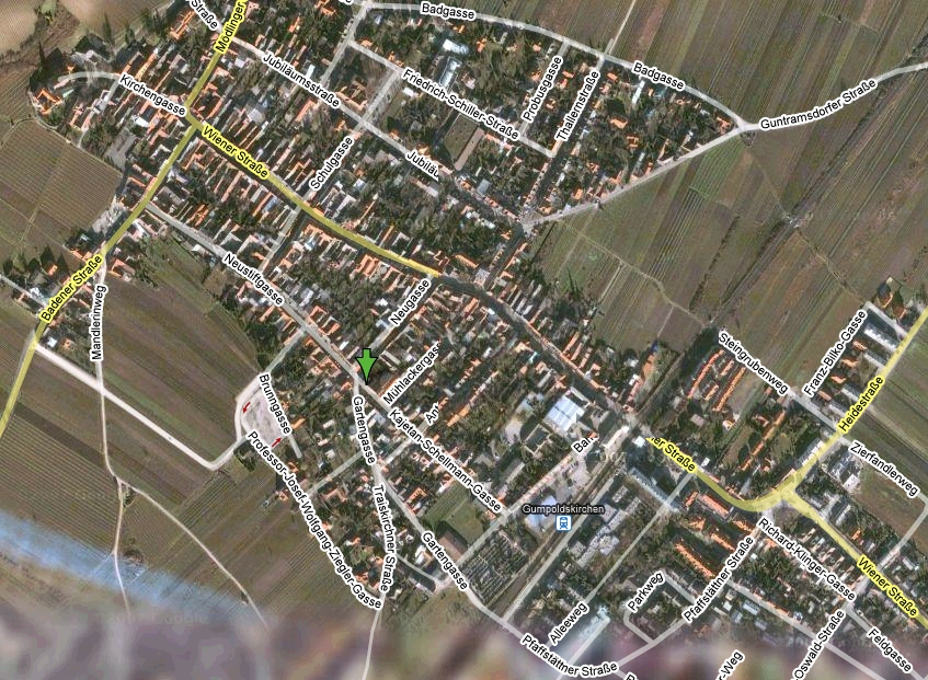 | A | Auf der A1 beim Knoten Steinhäusel (ca. 40 km vor Wien) auf die A 21 abbiegen Weiter bis zur Abfahrt Heiligenkreuz. Nach der Autobahnabfahrt zweimal links abbiegen Richtung Gaaden In Gaaden „einmal um die Kirche“ und gleich rechts abbiegen Richtung Pfaffstätten. Nach ein paar km links Richtung Gumpoldskirchen zuerst durch den Wald dann durch die Einöde. In Pfaffstätten links in die Weinstrasse abbiegen Richtung Gumpoldskirchen |